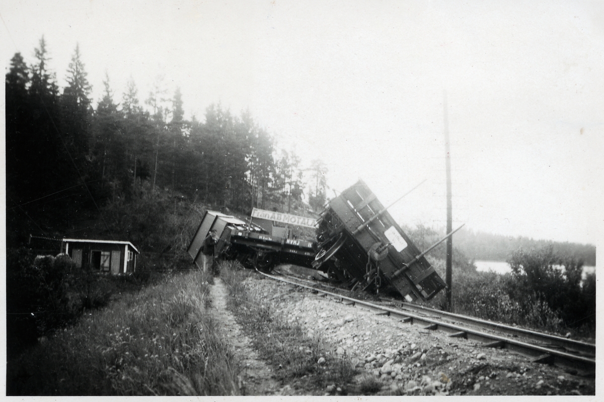 5 urspårade godsvagnar vid Storsjö. Norsholm - Västervik - Hultsfreds Järnvägar, NVHJ N 1131.