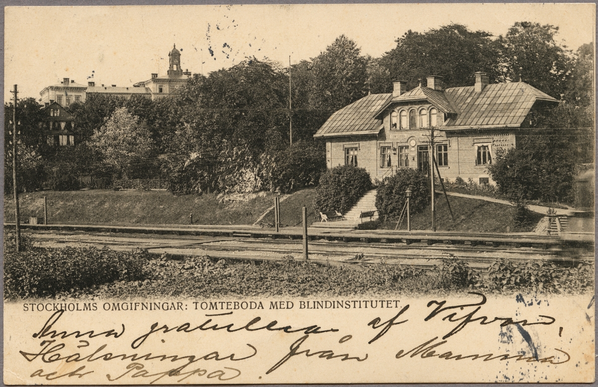Järnvägsstationen i Tomtedboda. Till vänster i bild skymtar Blindinstitutet.