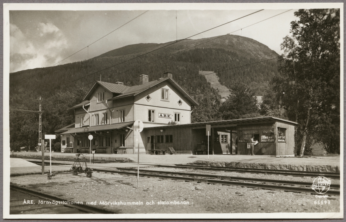 Järnvägsstationen i Åre. Bakom stationen syns Mörvikshummeln.