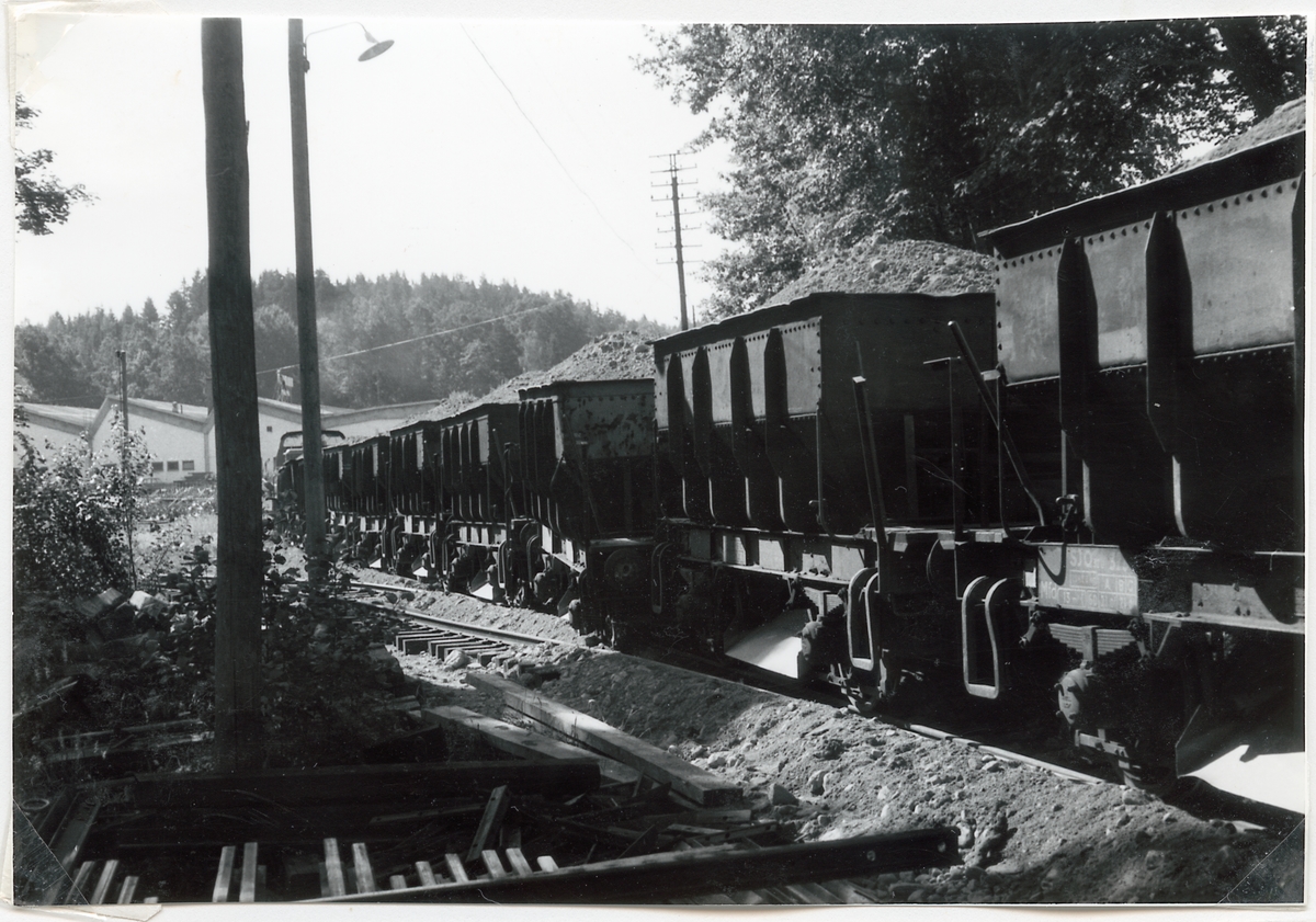 Urspårning under grusning av breddade järnvägsspåret till Överums bruks lager. Statens Järnvägar, SJQ32u Mfd.