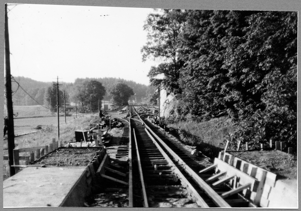 Vägomläggning och breddning till normalspår vid Överum. Foto från bron vid norra änden av bangården i Överum.