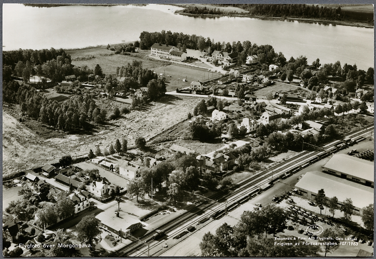 Flygbild över Morgongåva med bland annat lantbruksmaskiner till höger i bild.