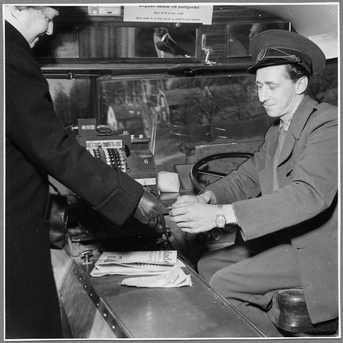 Busschaufför tar emot betalning för en bussresa.