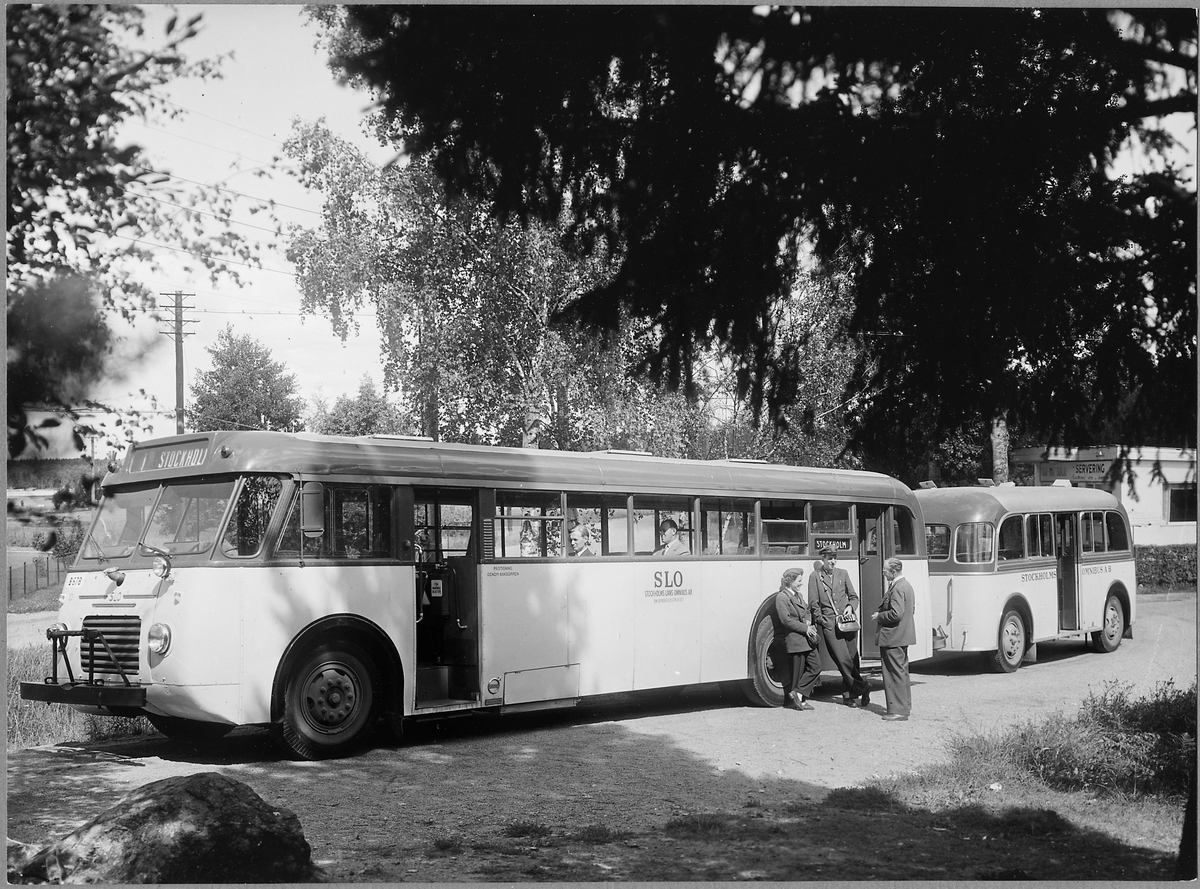 Volvo B 532 med påkopplad personsläpvagn. Stockholms Läns Omnibuss AB, SLO (Stockholm-Roslagens Järnväg, SRJ).