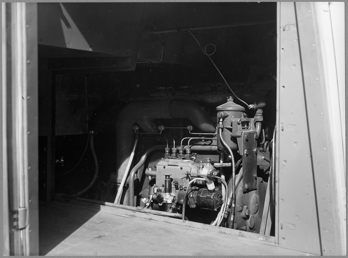 Motorn i buss nummer 62. Stockholm-Roslagens Järnväg, SRJ.