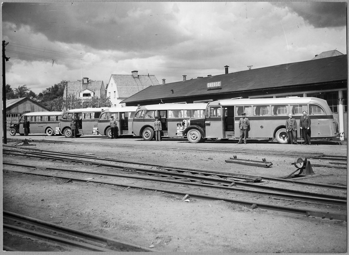 Bussar med sina chaufförer utanför ett garage i Norrköping.