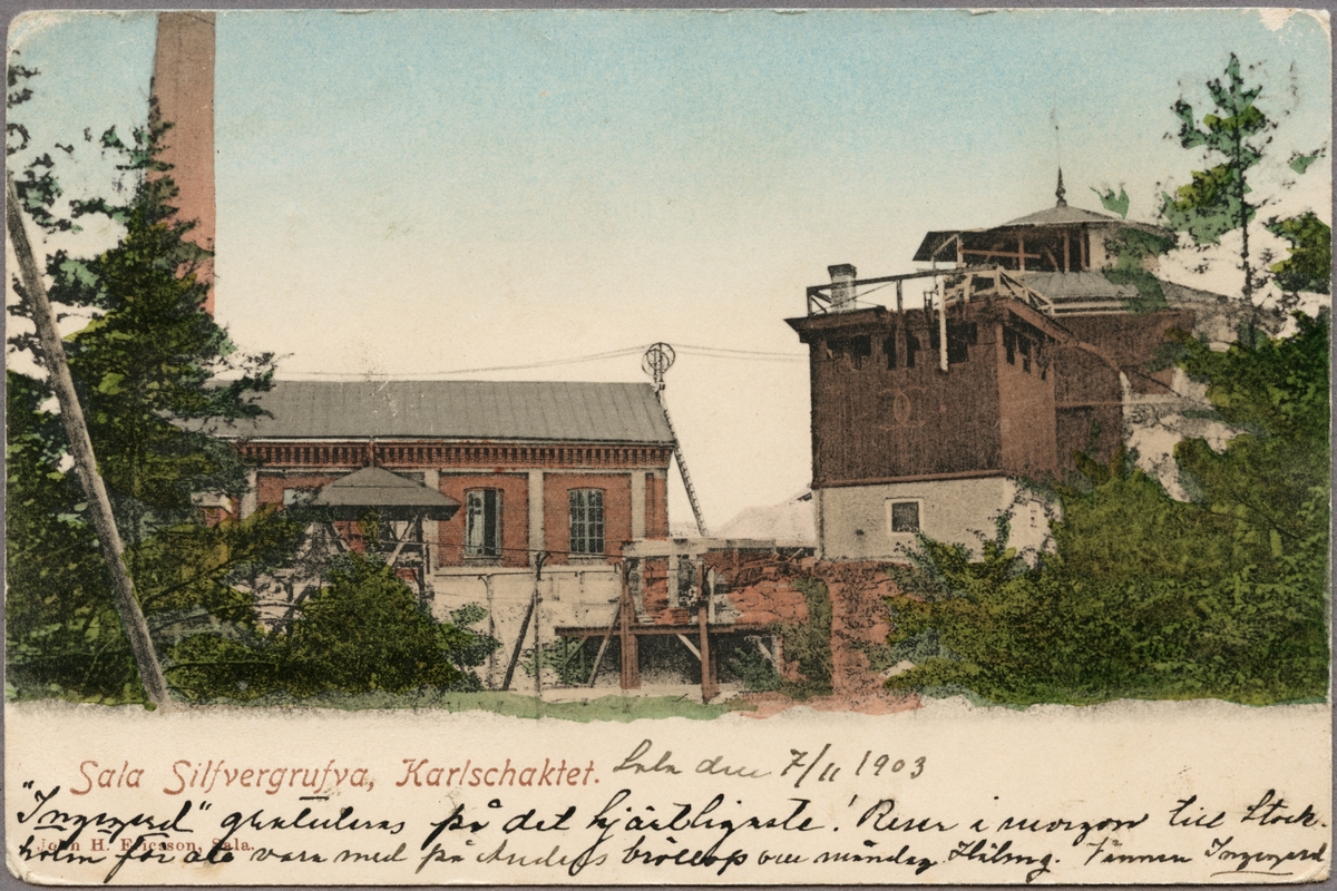 Karlschaktet vid Sala Silvergruva. Kolorerat vykort.