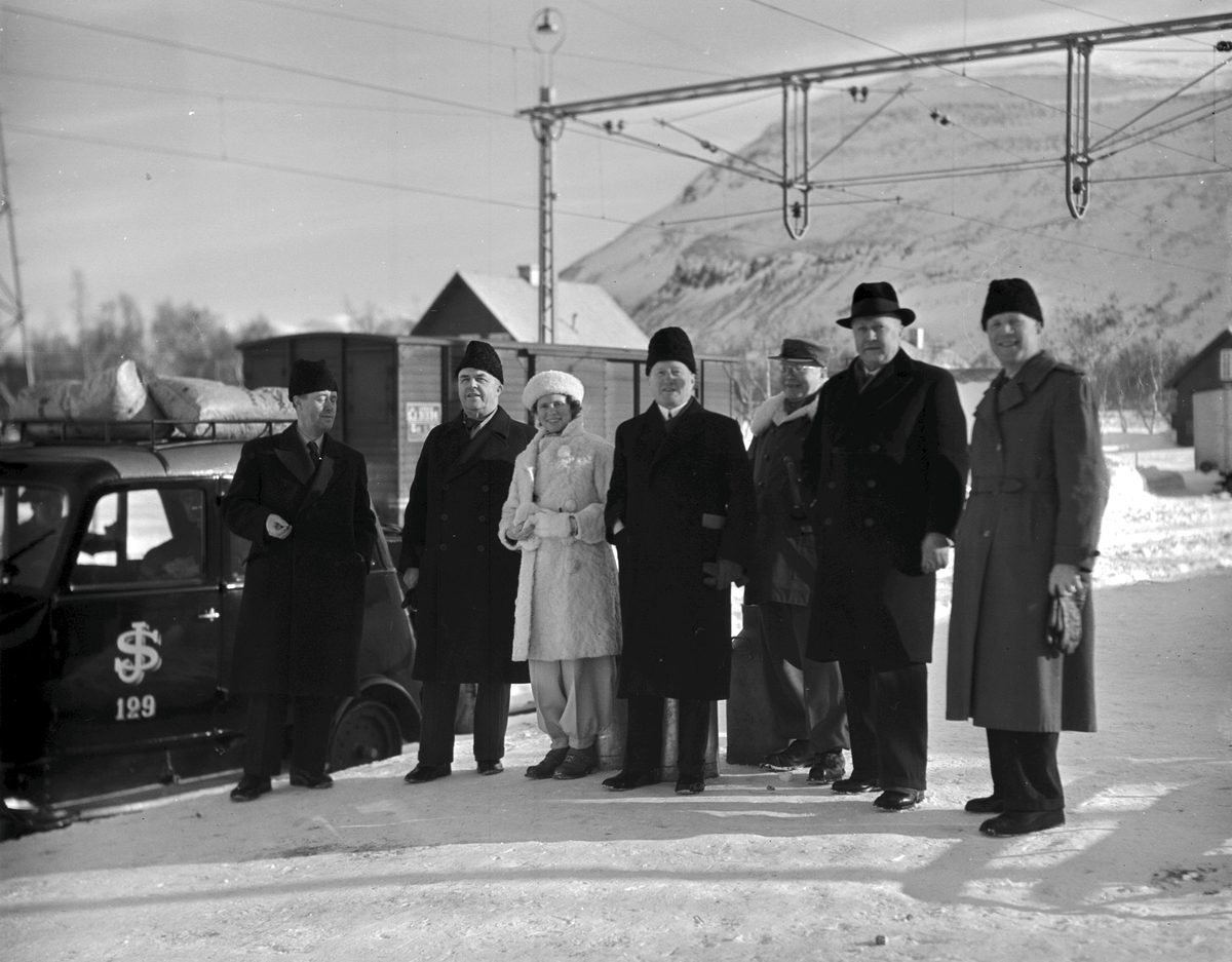 Vid Björklidens station. Från vänster Distrikschef, Dc, Schütz, Generaldirektör, Gd, Dahlbeck, Fröken ,Frk, Ahnfelt, Trafikinspektör, Ti, Lindblad, Byråchef, Brc, Lundqvist, Byråchef, Brc, Emers och Baningenjör, Biö, Wennberg