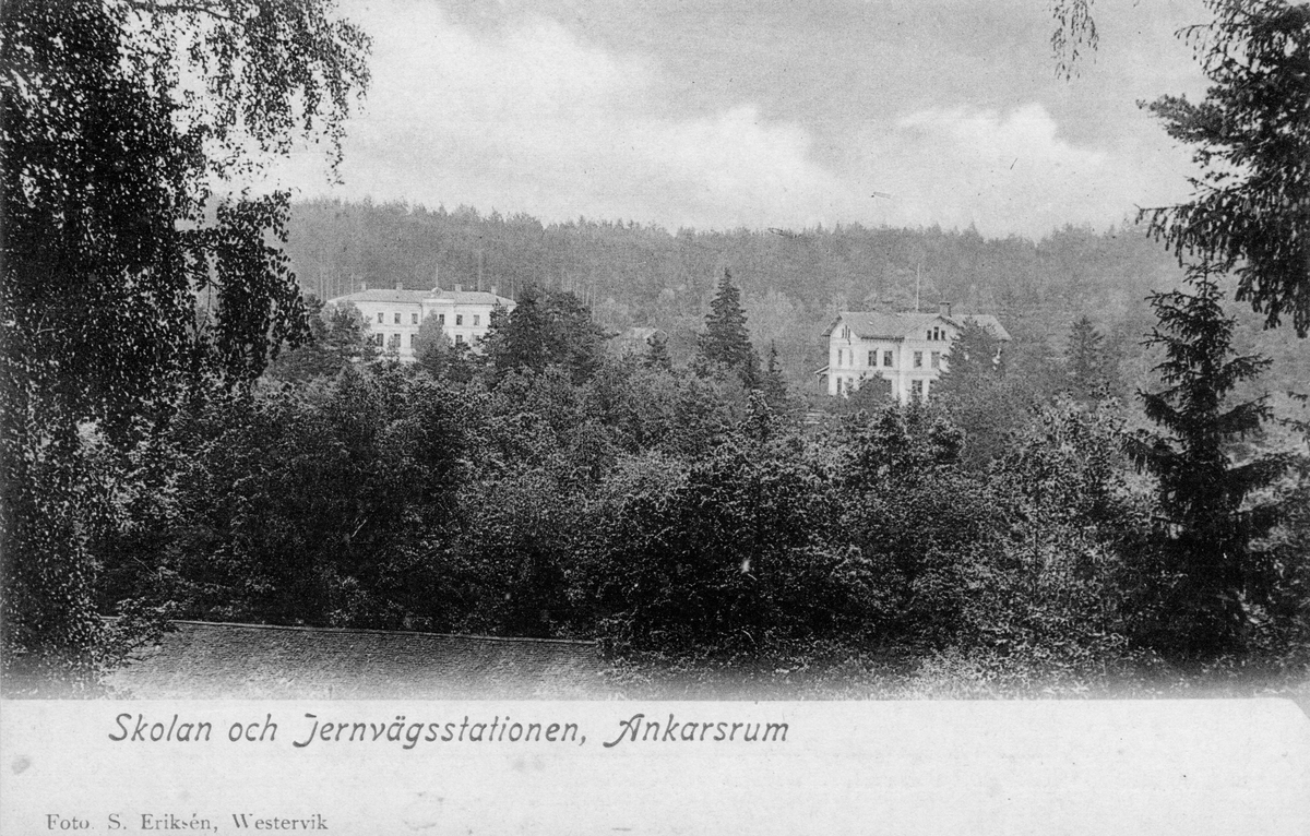 Vy från Ankarsrum. Till vänster syns en skolbyggnad, och till höger i bild skymtas Ankarsrum järnvägsstation.