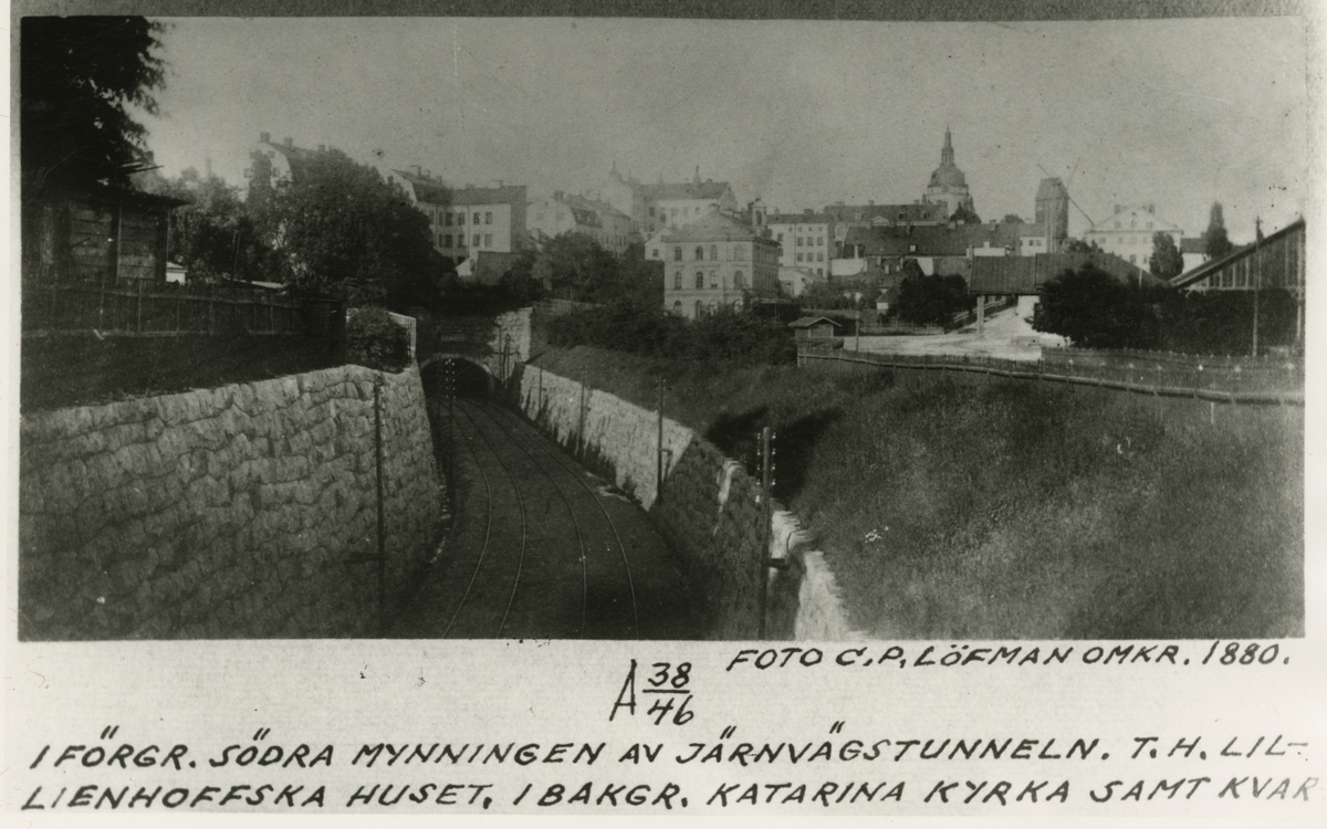 Statens Järnvägar, SJ, I förgrunden södra myningen av järnvägstunneln till höger lillienhoffska huset, i bakgrunden katarina kyrka samt kvarn.