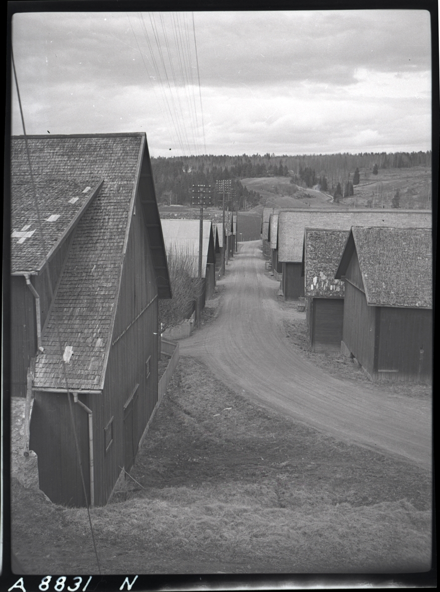 Djursdala by, bygata med ladugårdslängor. Bilden skannad från såväl negativ som positiv.