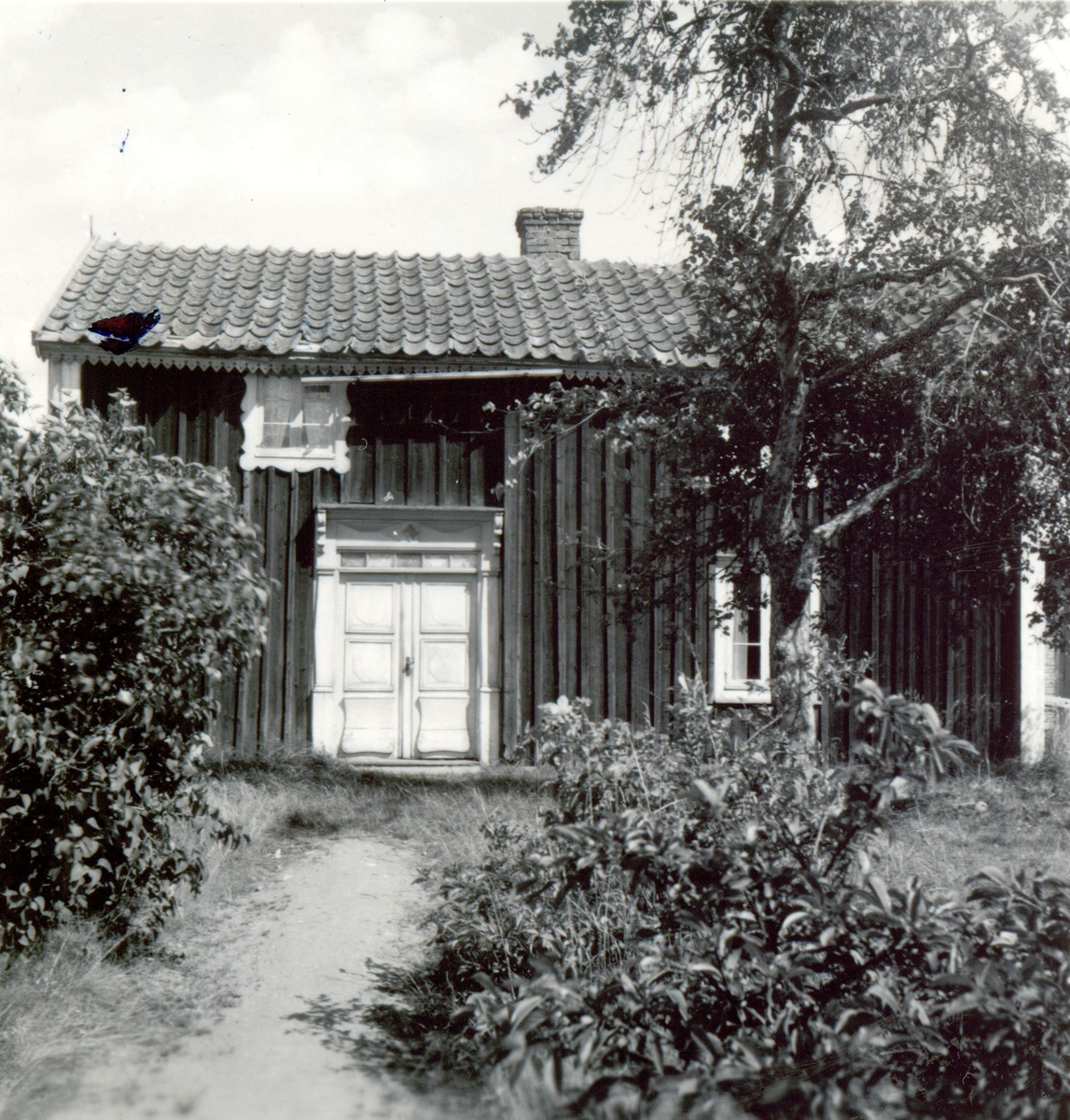 Ett bostadshus med träfasad.