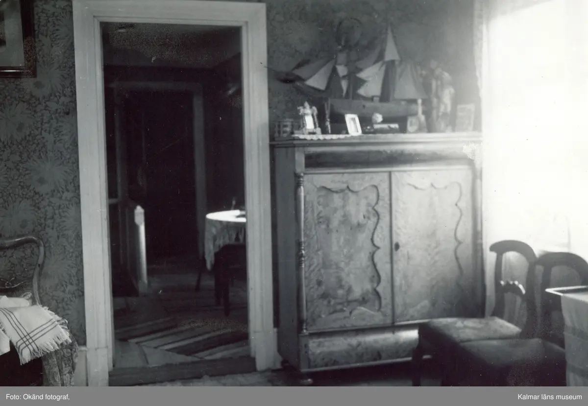 Åstedtsgården. Dörr mot förstugan, skåp och fartygsmodell.