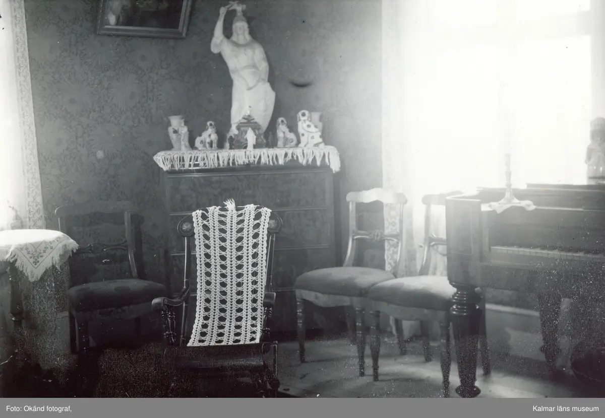 Skulptur, byrå, gungstol, piano, stolar och bord i Åstedtsgården.