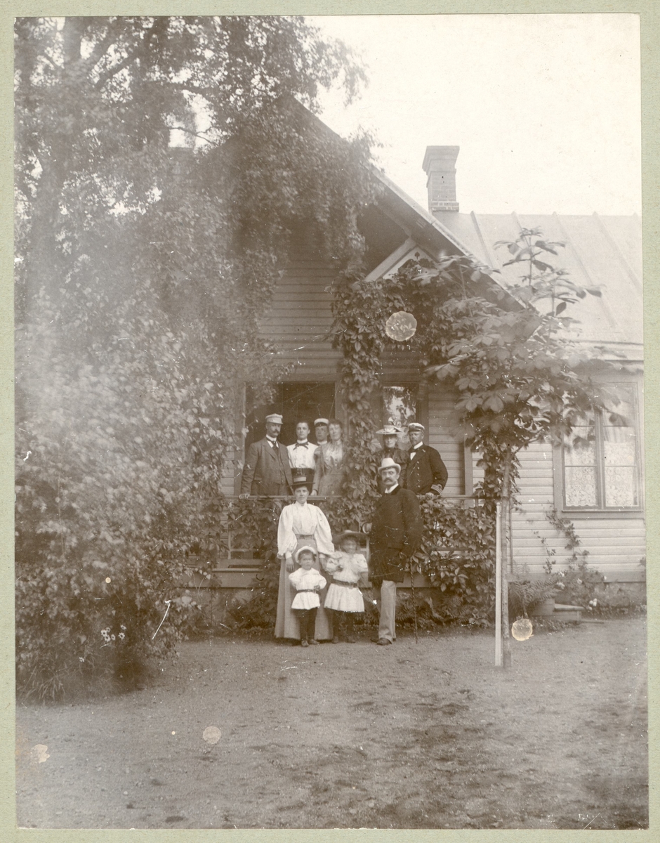 Personer på en veranda till ett okänt hus.