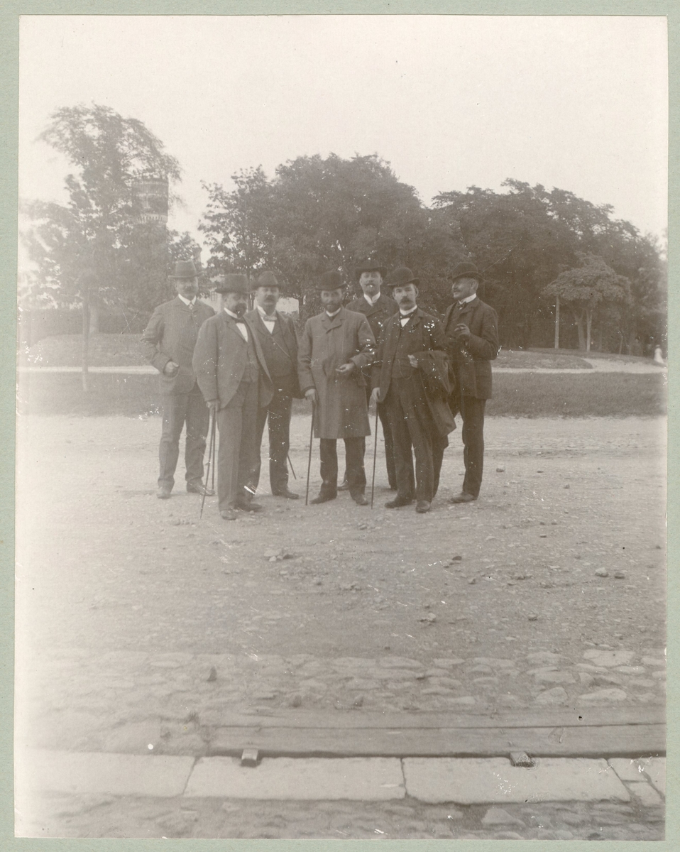 Herrar i kostym, rock, hatt och käpp. Gamla vattentornet syns i bakgrunden.