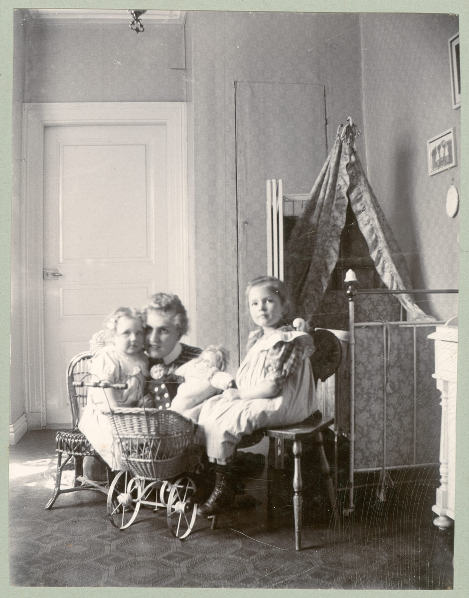 Svens Sundbergs fru med två barn, dockor och dockvagn i en barnkammare.