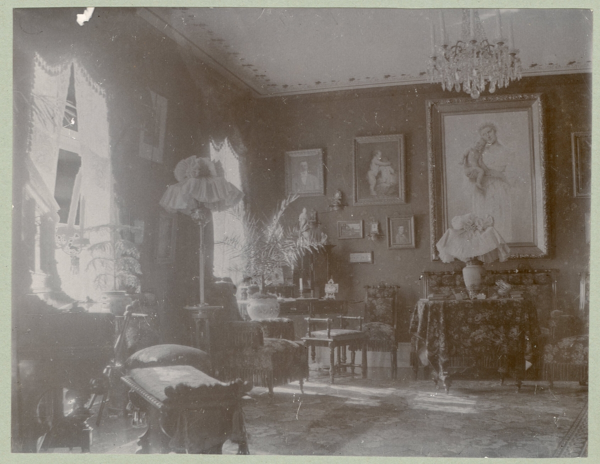 En salong i Sven Sundbergs hem med bland annat tavlor och en schäslong.