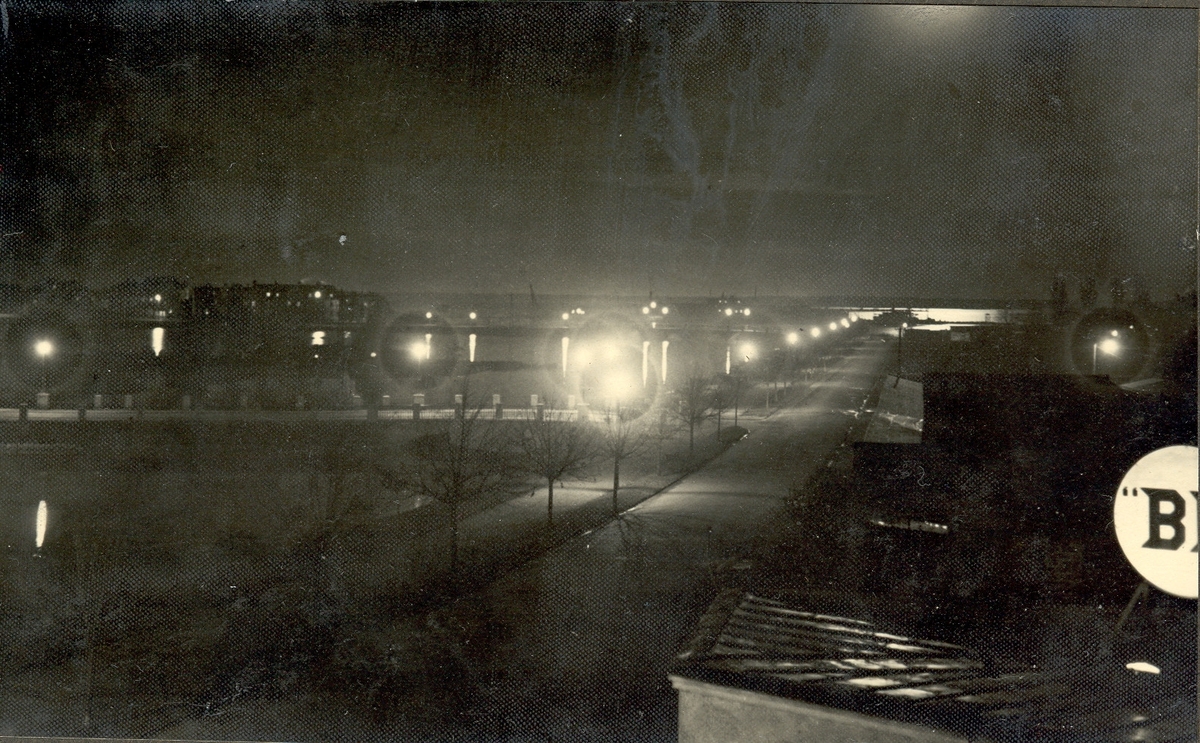 Södra Kanalgatan med bro, lyktor och bensinstation.