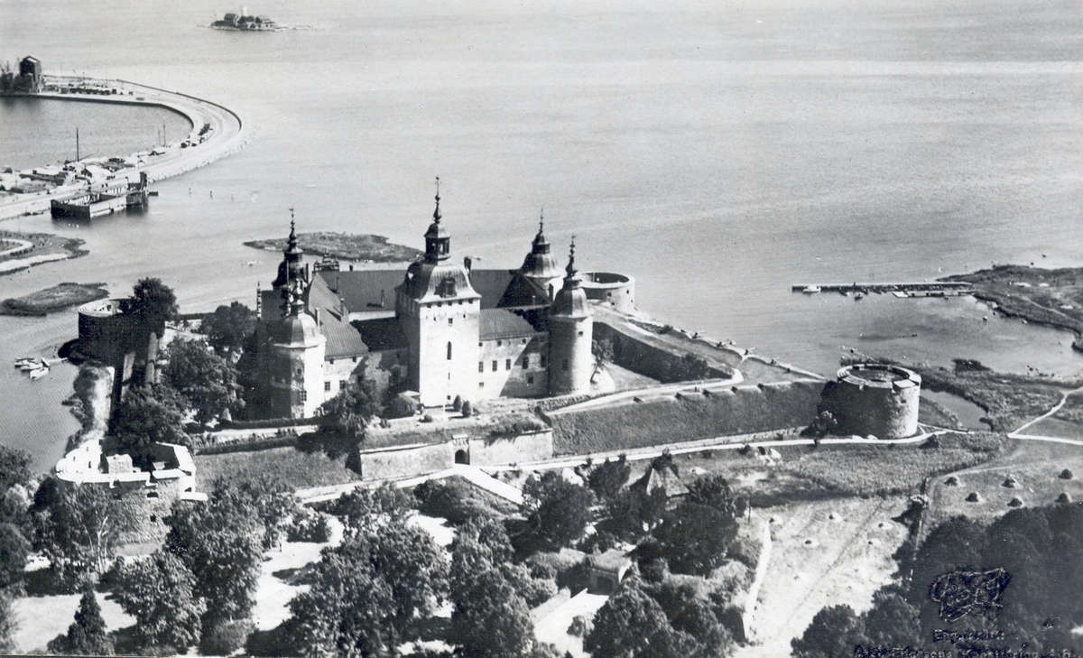 Flygbild på Kalmar slott med Kungsmakstornet, Kuretornet och Rödkullatornet riktat mot kamerean.