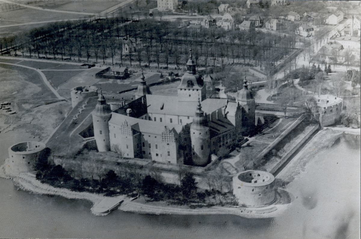 Flygbild på Kalmar slott. Observera bryggan öster om slottet.