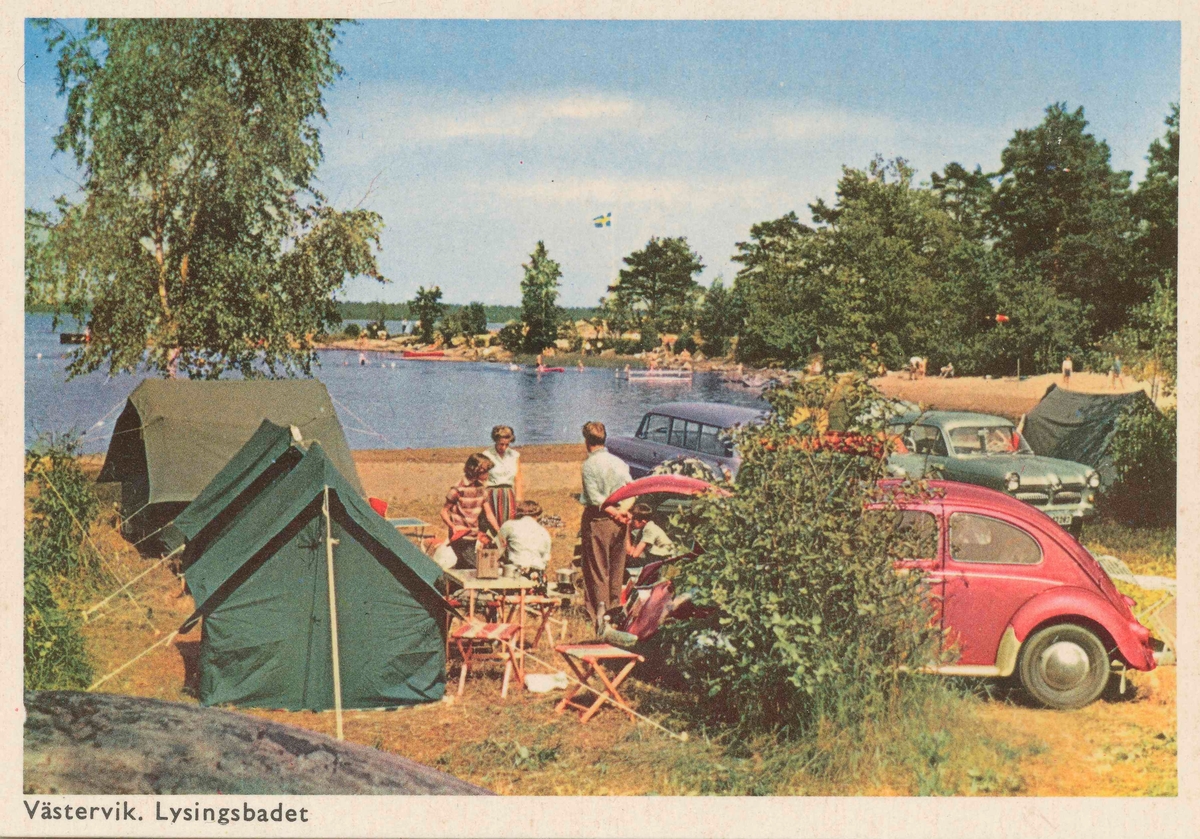 Lysingsbadet, Västervik. Tält, familj och en Volkswagen i förgrunden.