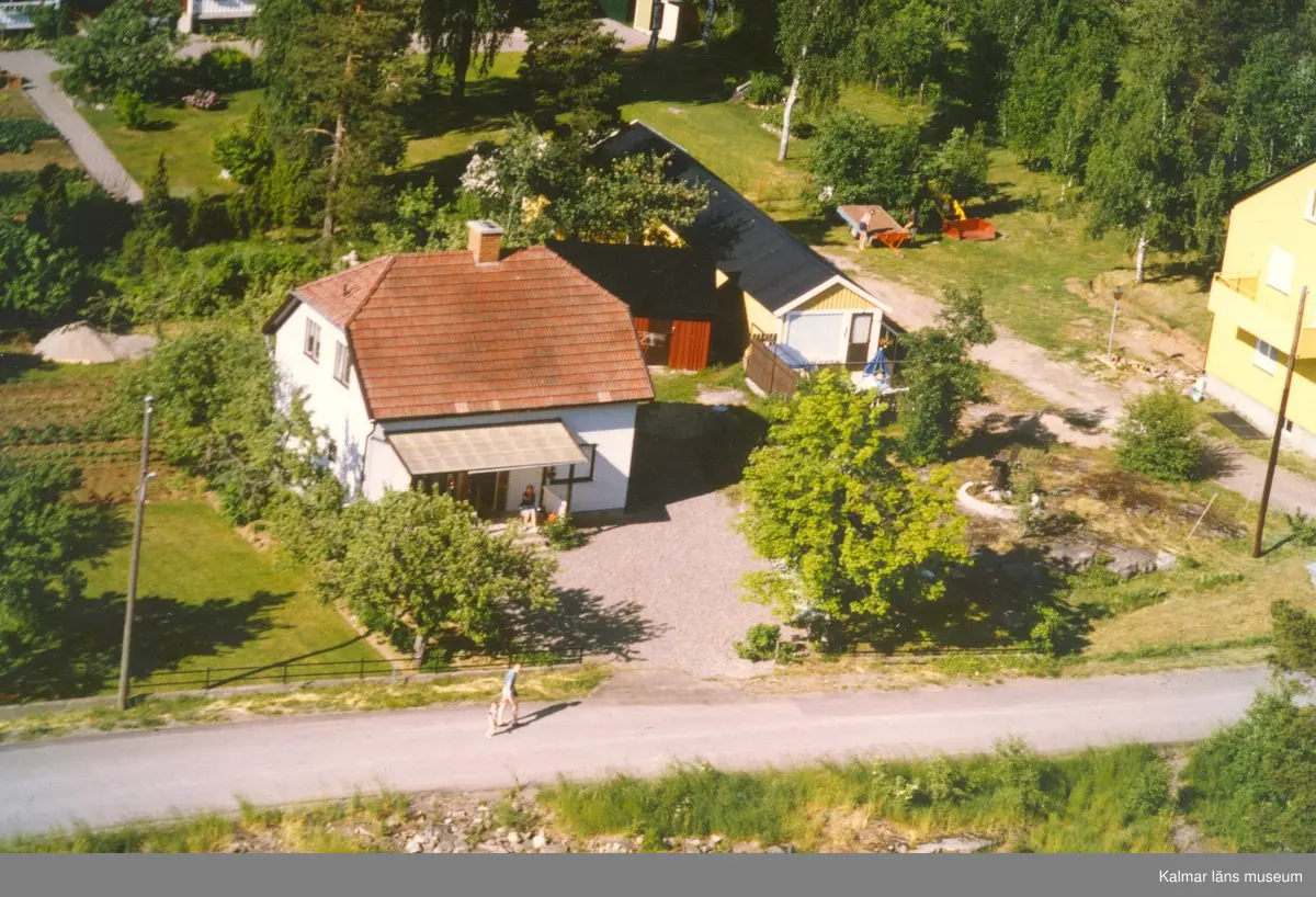 Flygfoto på enfamiljshus med trädgård i Bäckebo.