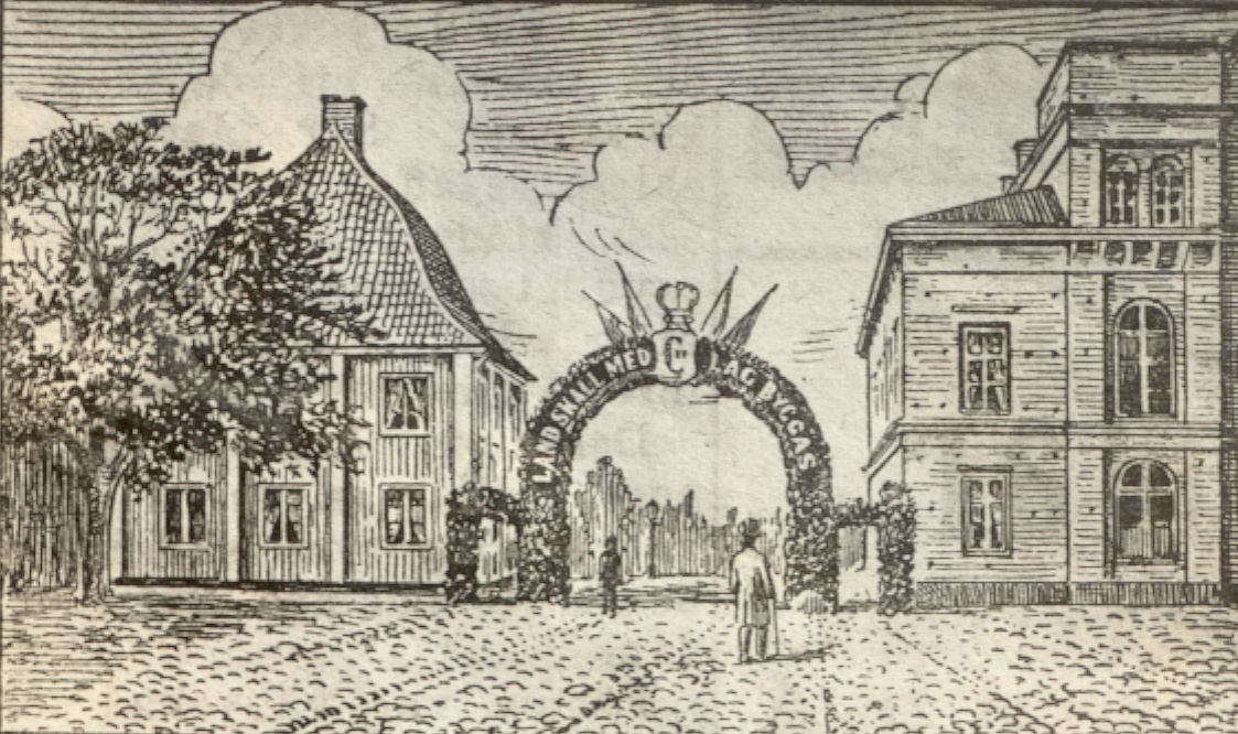 Mellan nya Teatern och Kockska huset reste sig den äreport, som byggts till ära för Carl XV, då han i september 1864 besökte Kalmar. "Land skall med lag byggas" var hans valspråk.