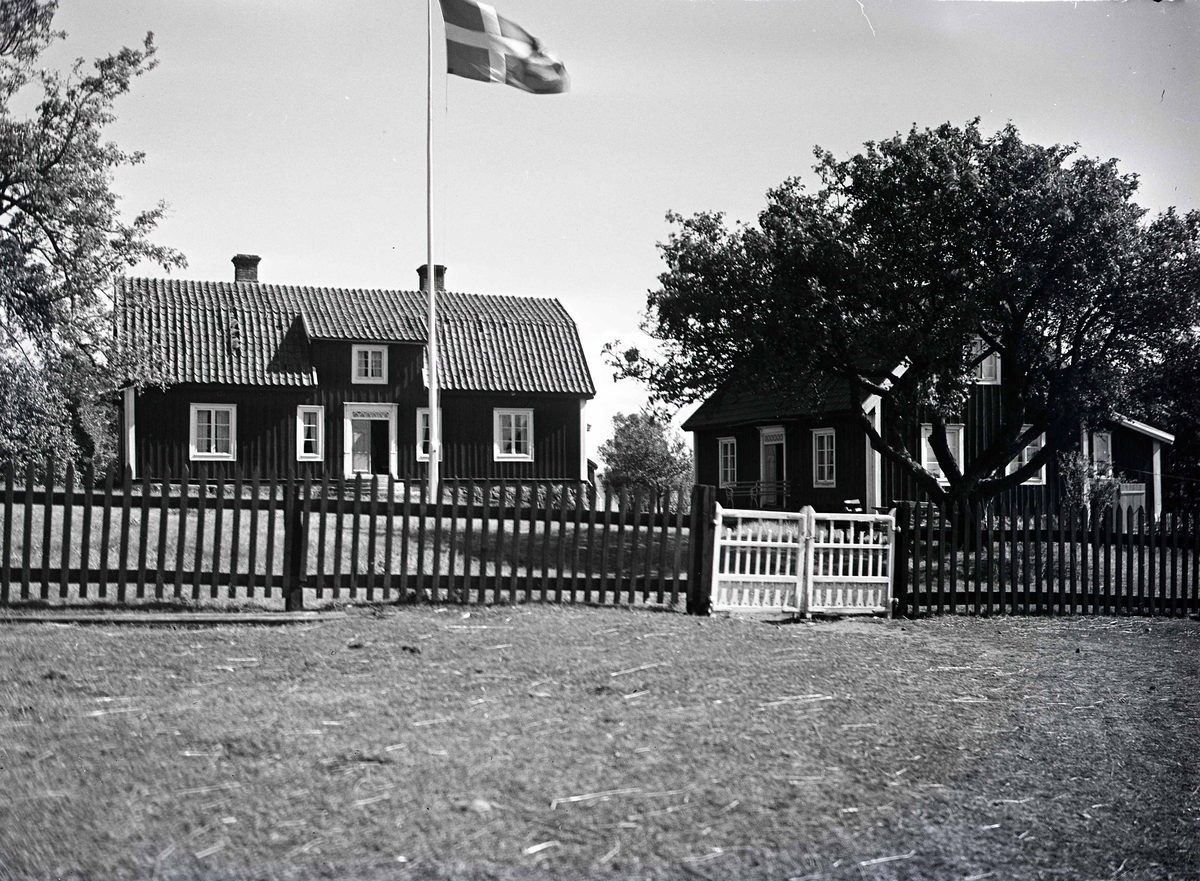 Bostadshus och flagga bakom staket med grind.