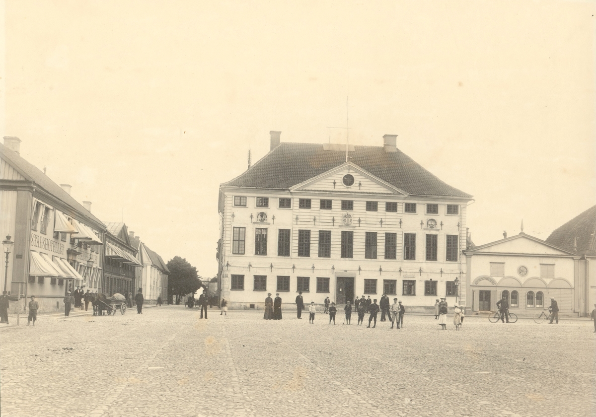 Stortorget i Kalmar med rådhuset. Det lägre huset bredvid rådhuset var besiktningsbyrå för det kött som såldes på torget. I folkmun kallades huset "Synagogan".