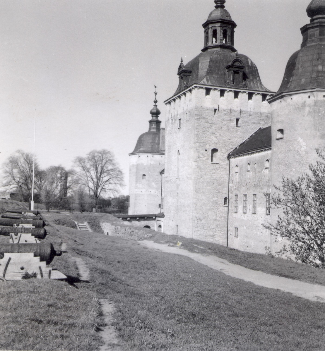 Kanoner på västra vallen till Kalmar slott. Kuretornet, Kungsmakstornet och Rödkullatornet syns i bild.