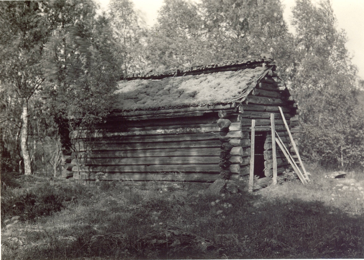 En bod med liggtimmer, korsknutar och torvtak vid Avesjön, mellan Fogelfors och Grönskåra.