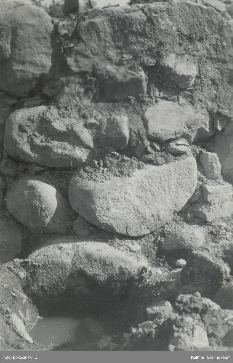 Fogelqvists tomt. Parti av gamla stadsmuren. Halvrunt torn i muren, yttersidan intill grundvatten från norr.