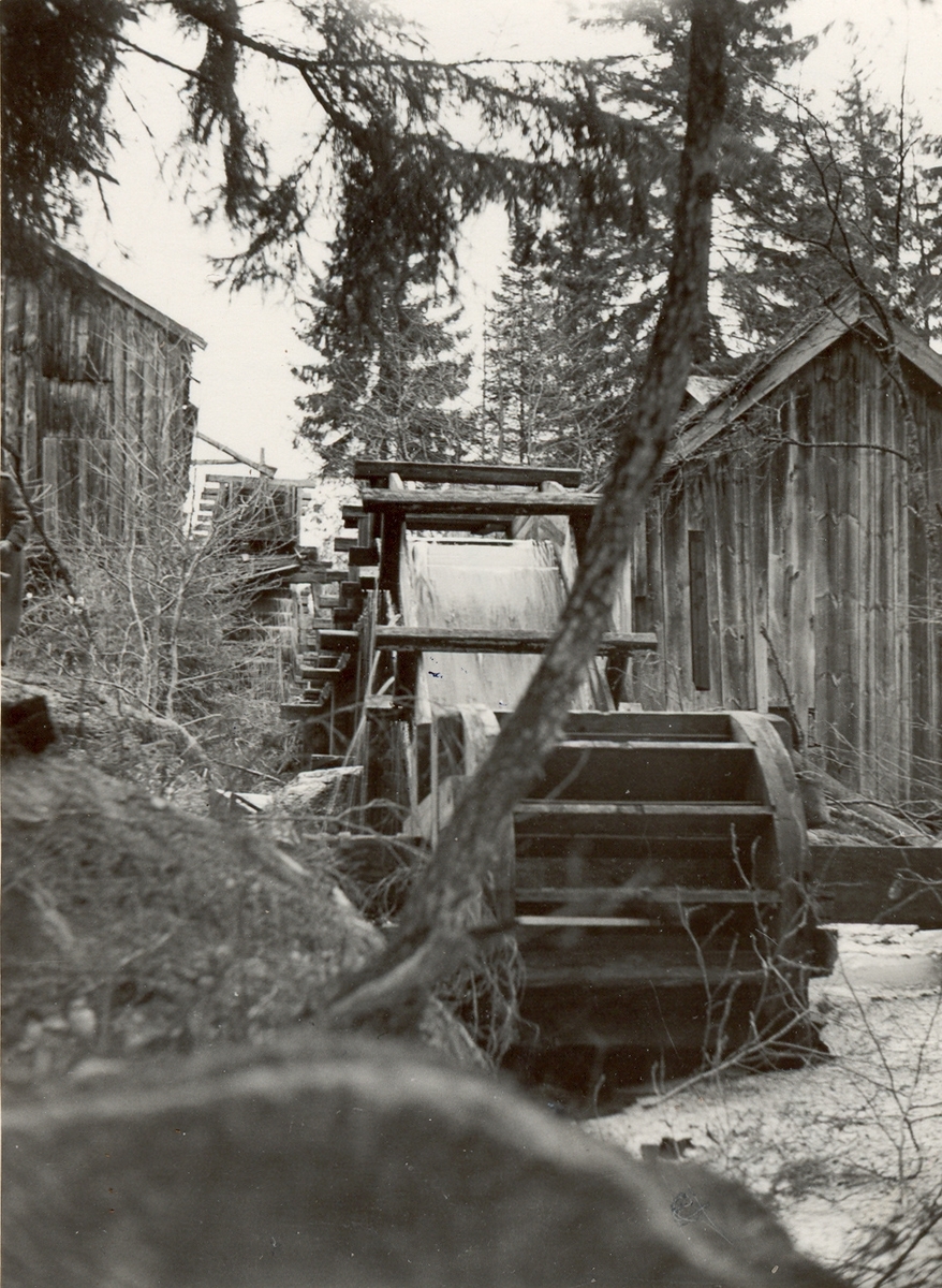 I mitten: Ränna och hjul till en spånhyvel i skogen vid Pelarne.