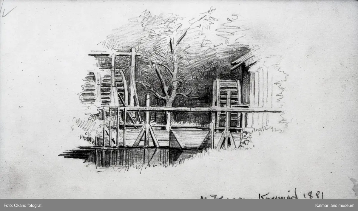Teckning av Nils Kreuger 1881. Vattenhjul.