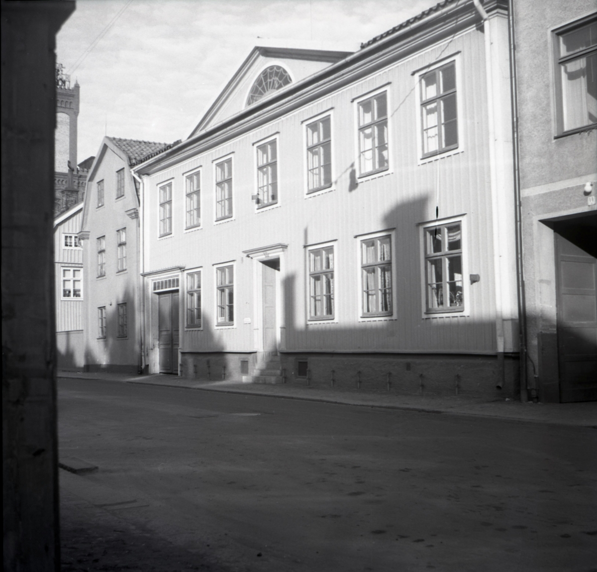 Stadsvy från kvarteret Krögaren på Kvarnholmen, bostadshus med putsad fasad med tympanon.