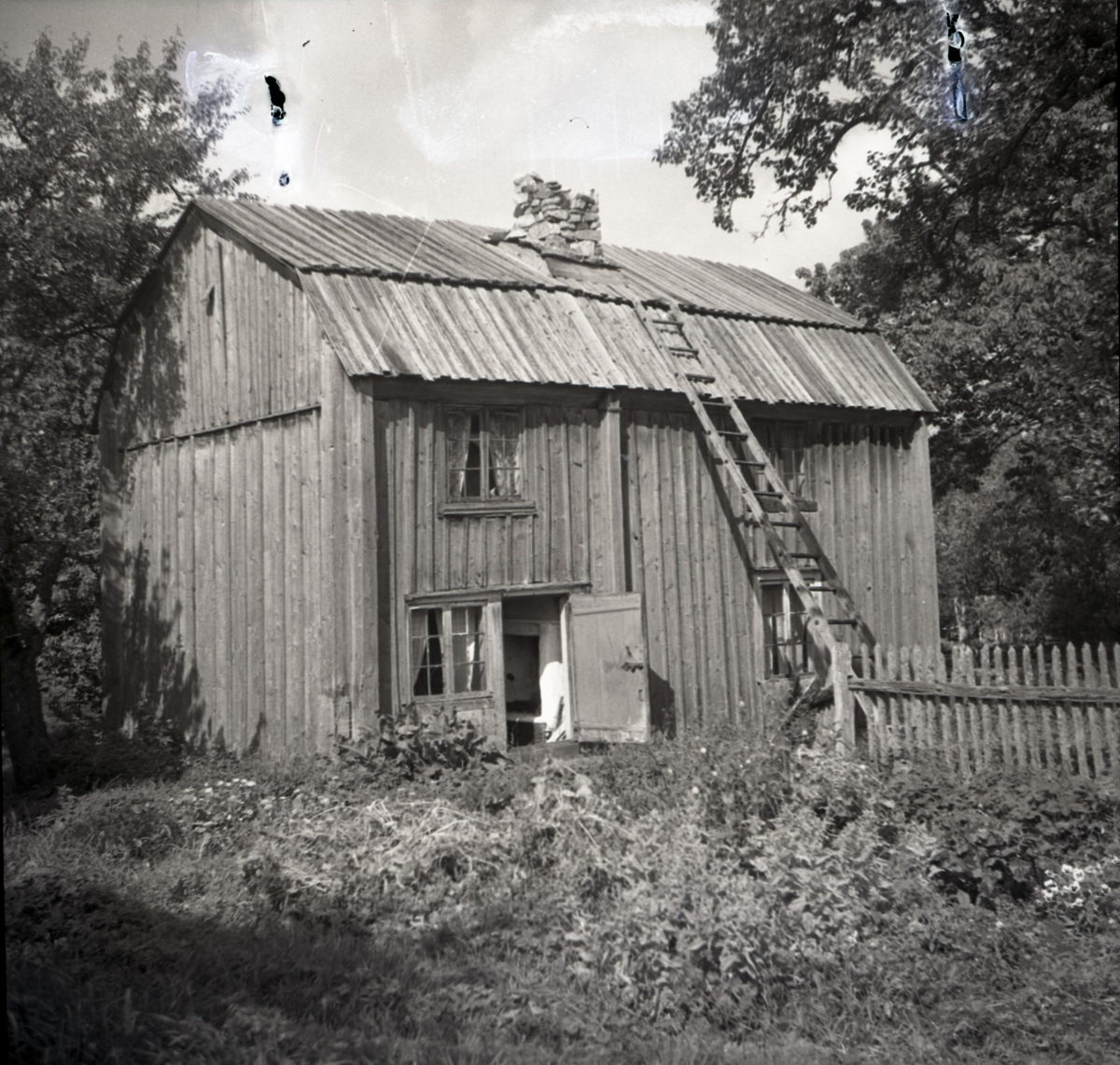Byggnadens inre fasad med köksingången. Skorsten i kallmur.