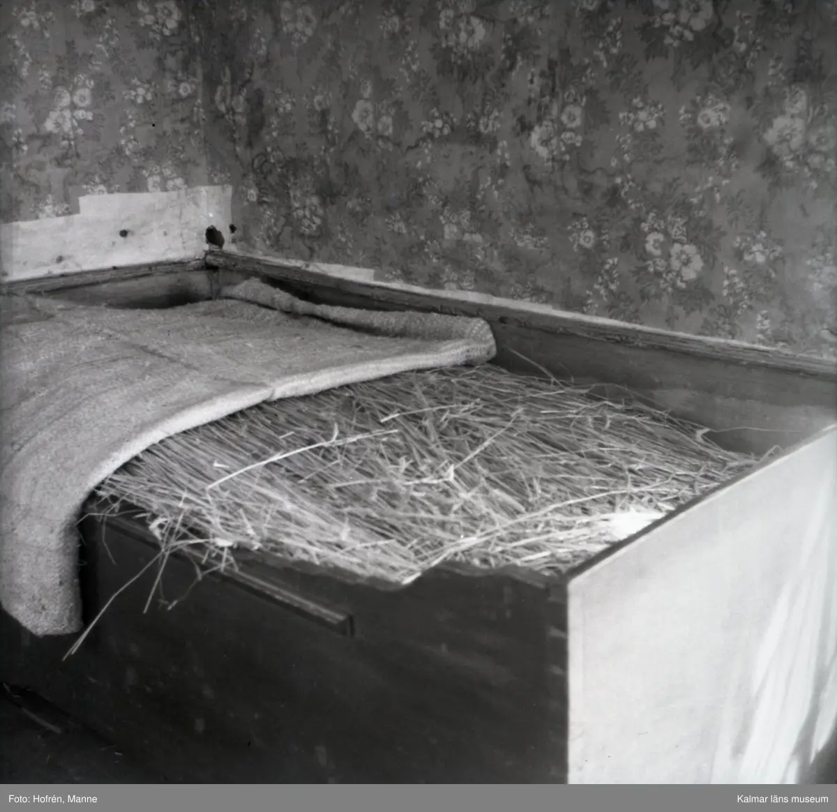 Väggfast halvsäng med lös långhalm och sängmatta.