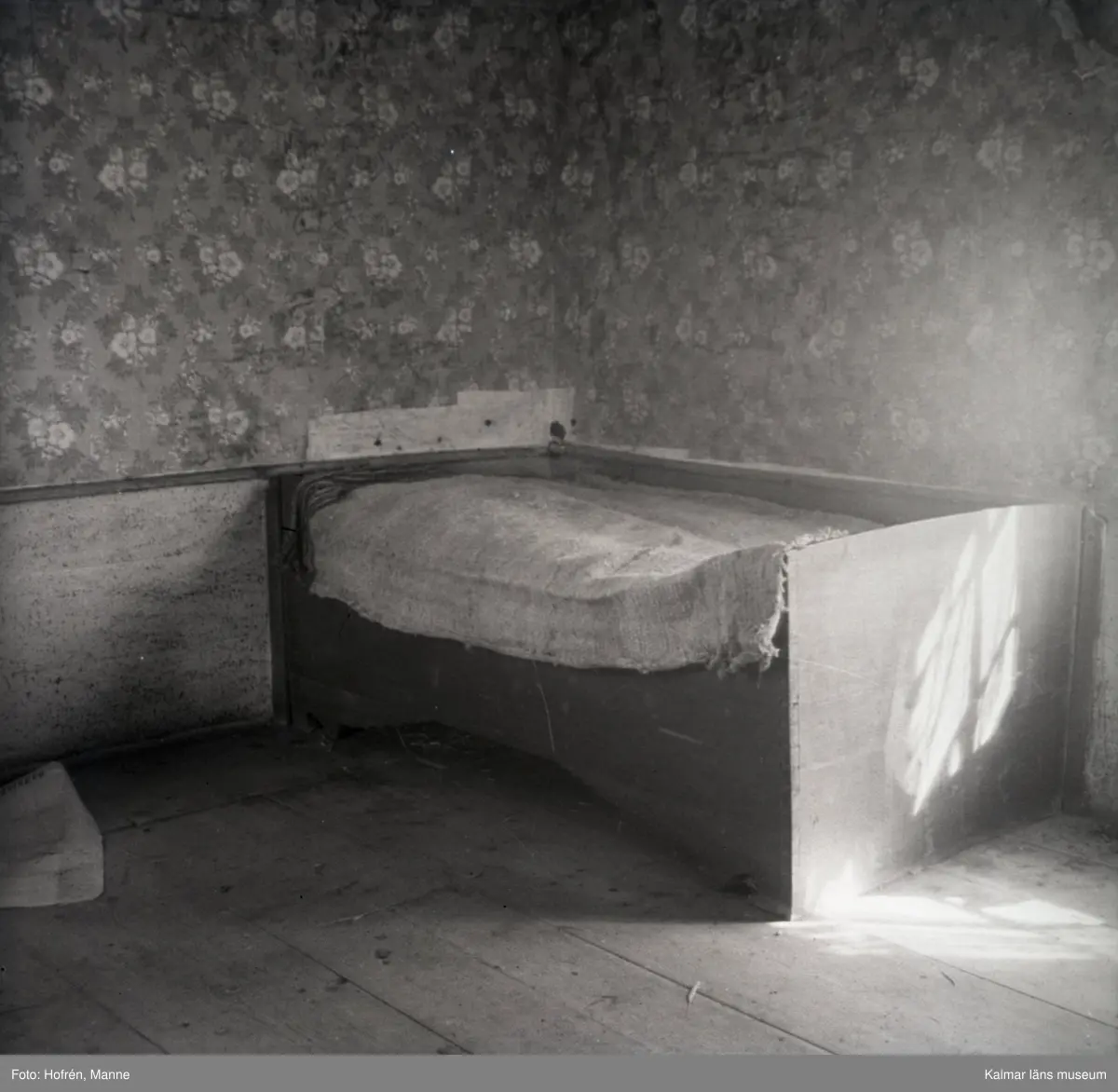 Övre våningens storstuga med väggfast halvsäng, lös långhalm och sängmatta.