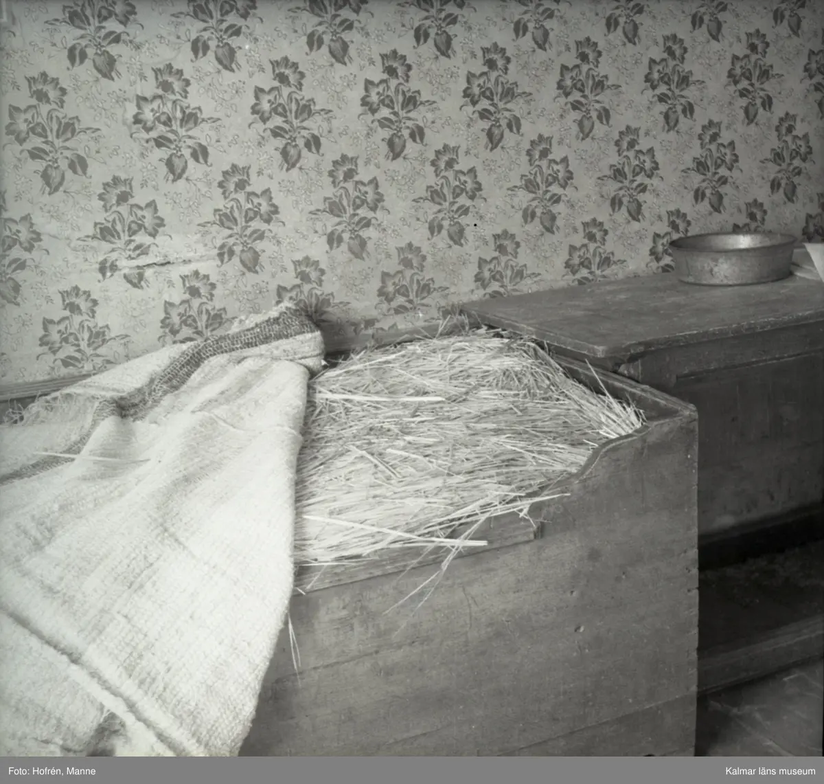 Väggfast halvsäng med lös långhalm och sängmatta.