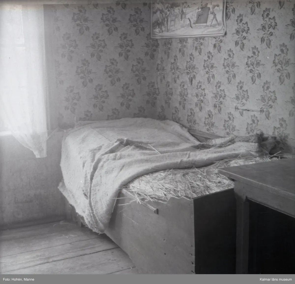 Övre våningens kammare, väggfast halvsäng med lös långhalm och sängmatta.