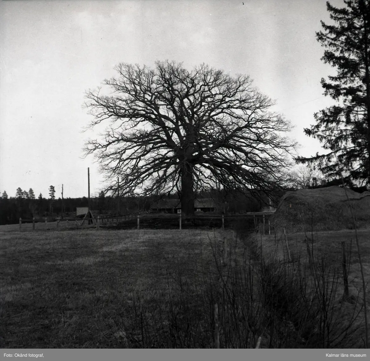 Utsikt över gårdens ägor med en stor ek i bakgrund vid Dröppshults gård.