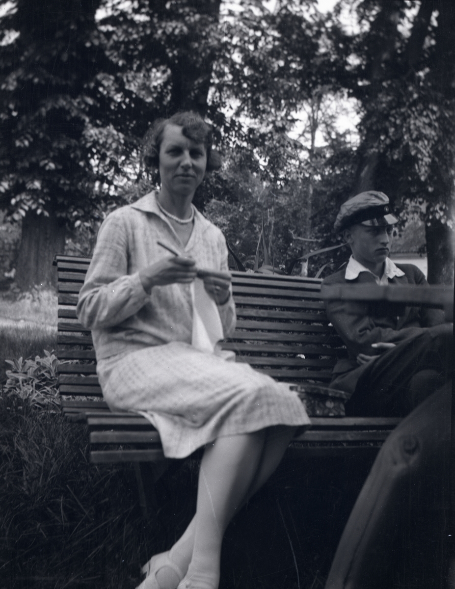 Hillevi, gift med Olof. Bredvid sitter Tore på en bänk i Tuna trädgård.