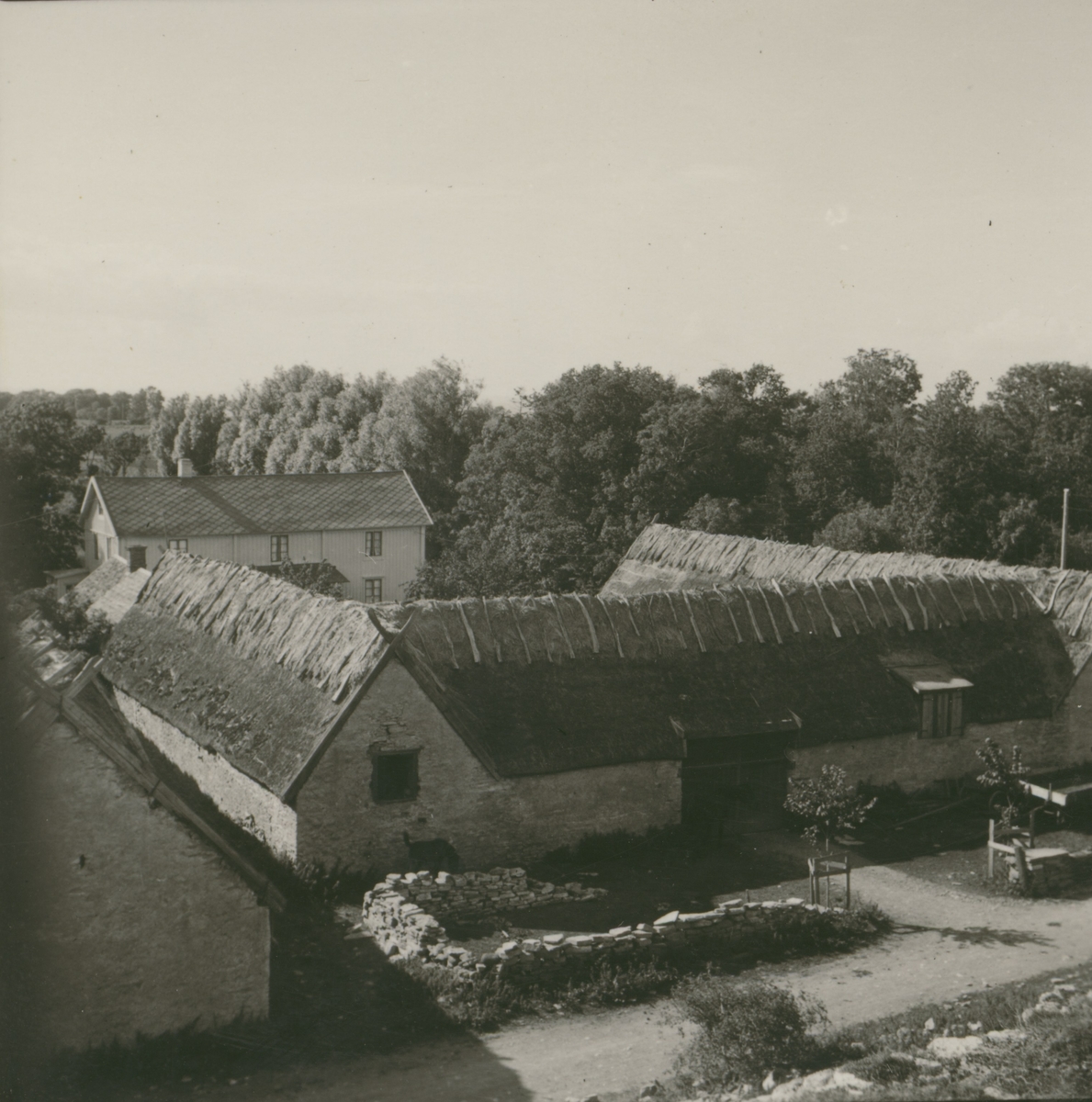 Ekonomibyggnader med stråtak och takryttare i Gettlinge.