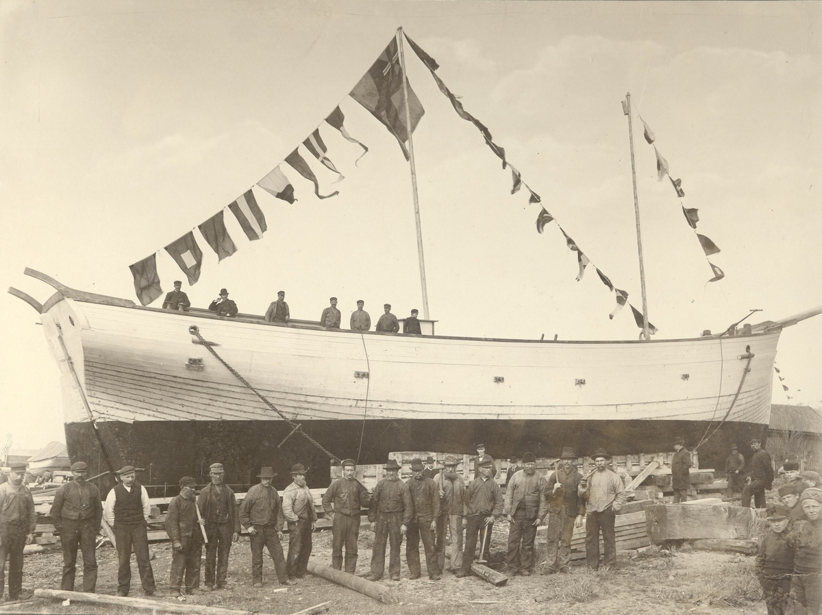 Varvsarbetare vid ett fartyg med flaggspel på varvet i Kalmar.