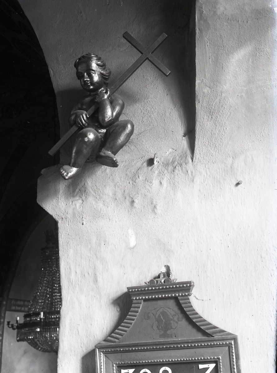 En kerub ovanför psalmtavlan i Hossmo kyrka.