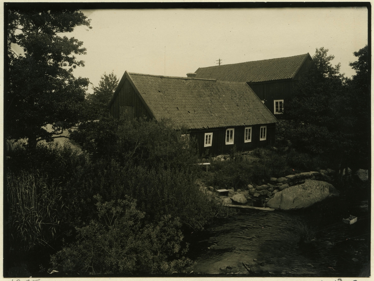 Ekomonibyggnader vid en å i Broholm.