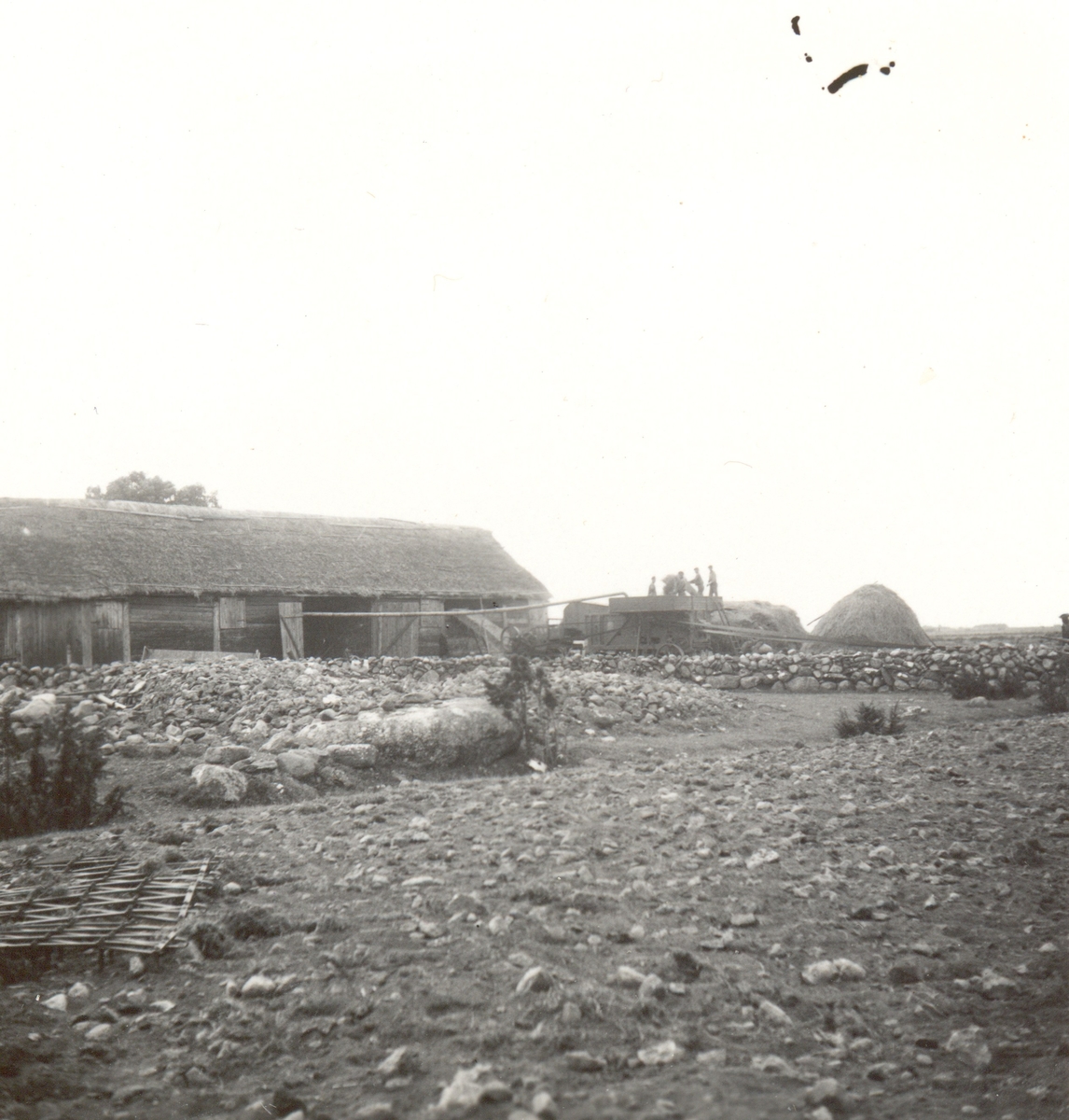 Ekonomibyggnad med torvtak i Petgärdeträsk. Tröskverk på ladugårdsbacken.
