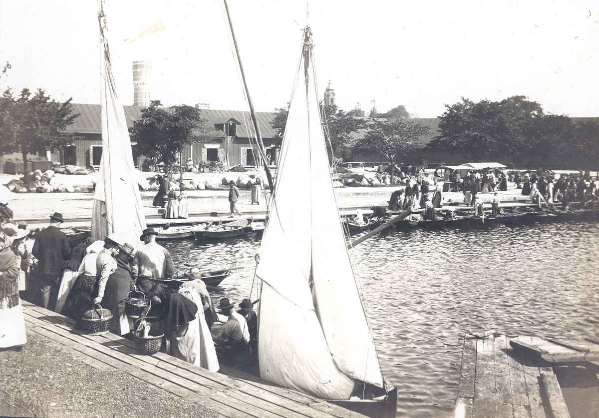 Fiskförsäljning på Ölandshamnen. Bruksbåt med sprisegel syns i förgrunden.