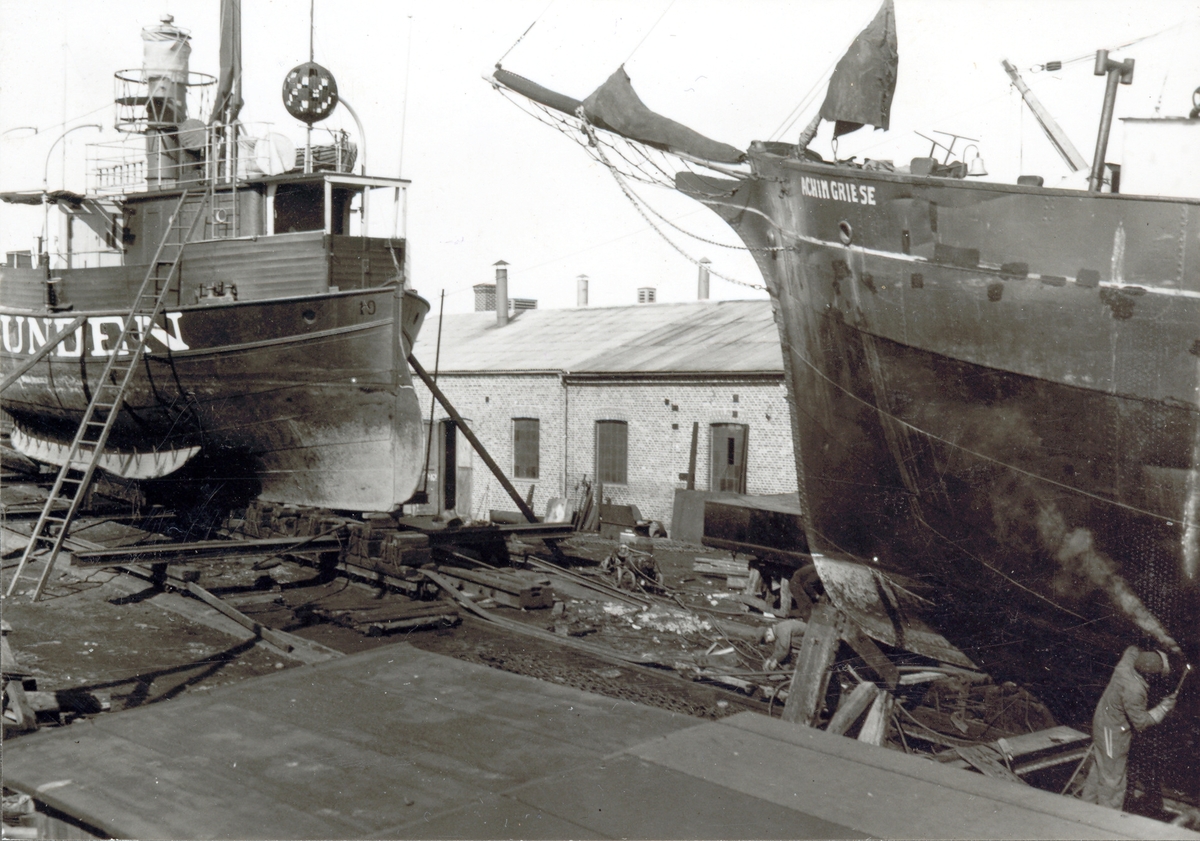 Fartyg på varvets fartygsslip i bakgrunden rörverkstaden. Bild tagen på Varvsholmen i Kalmar.